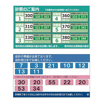 診察待ち順番、会計待ち順番を受付番号で画面表示し待ち時間のストレス解消します。