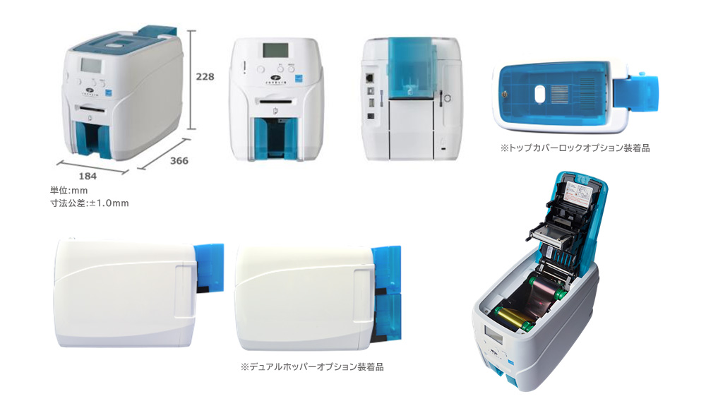 | 機能 | 片面プリンタ本体 | 両面プリンタ本体 | 両面プリンタに磁気 エンコード機能付き | 両面プリンタに 非接触 ICエンコード 機能付き |