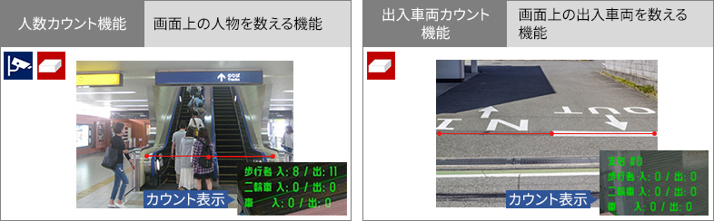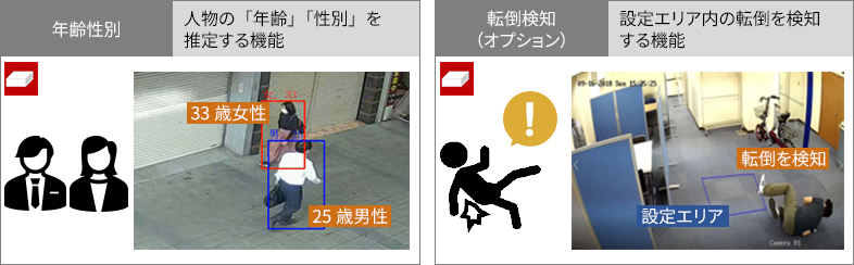 人や乗り物を認識する機能、侵入、徘徊、人数カウントなど多彩な検知機能があります。