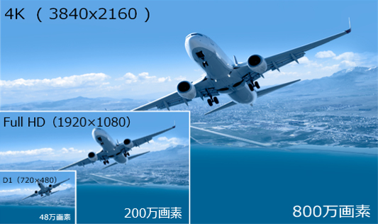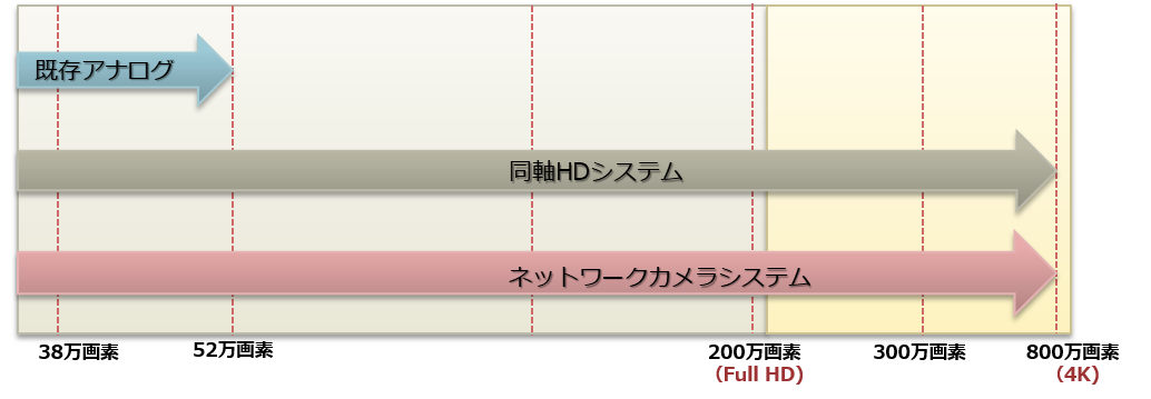今まで有利とされていたネットワークカメラシステムと同等の200~800万画素の高画質に対応しています。