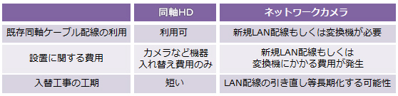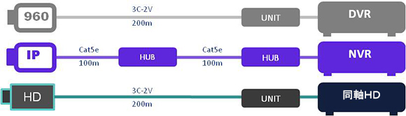 同軸HDシステムは既存の同軸ケーブル配線を流用しながらも、従来のCCTVシステム以上の配線距離に対応しているので、100m置きにHUB設置が必要なネットワークカメラより自由なシステム構築が可能です。 (3C-2V配線で200m、5C-2Vで500mまで推奨)