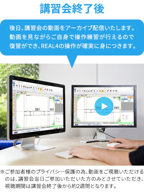POINT3講習会終了後、ご自身で復習が出来るよう講習会の動画をアーカイブ配信いたします。講習会ではマニュアルに載っていないワンポイントの説明もあるので、活用できる知識が増えていきます。
