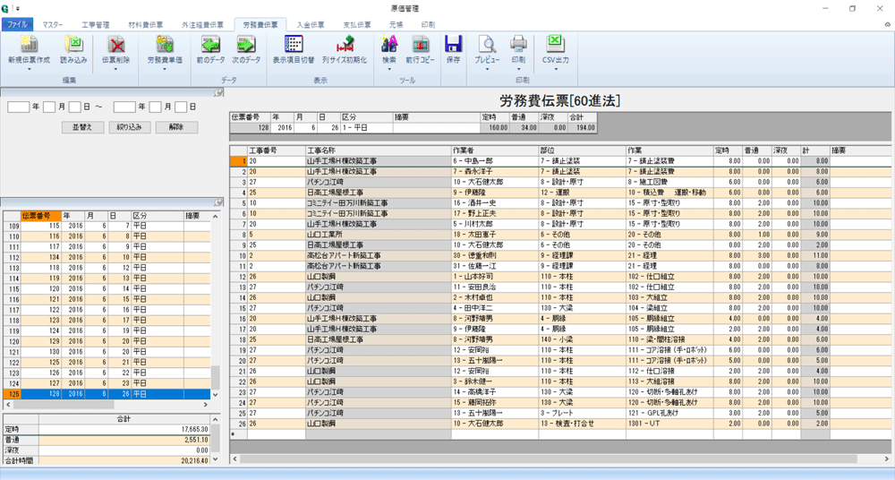 ・工数別(工数集計表、作業者別工数集計表、作業者別工事別工数集計表)