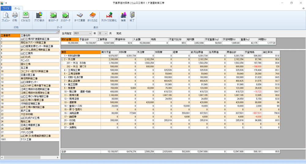 ・工事別(予定重量対照表、出来高一覧表、工事別費目集計表、入金明細表、間接費一覧表、予算原価対照表(Excel出力のみ))