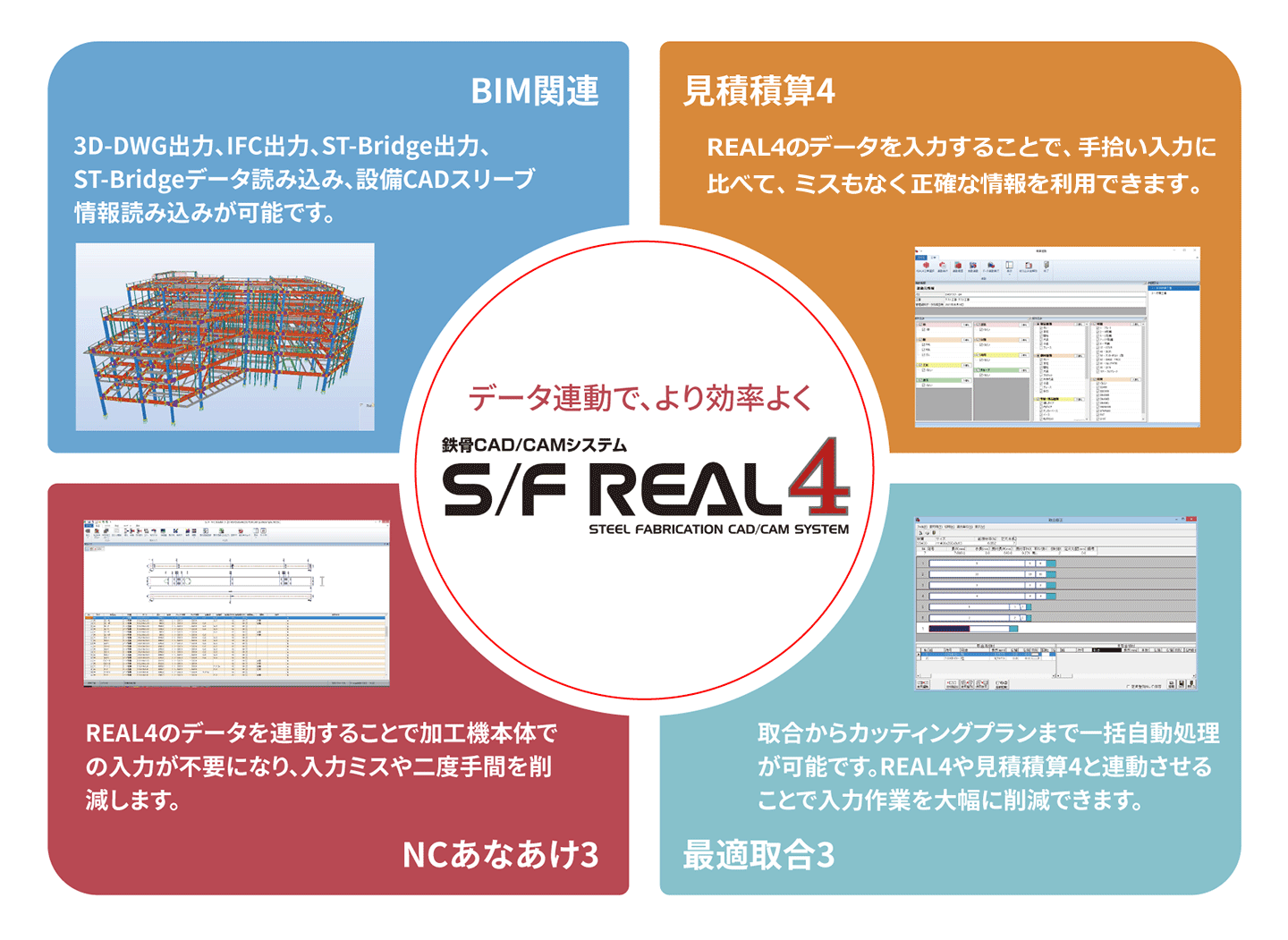 REAL4で作成したデータを見積積算4・最適取合・NCあなあけ、各システムへ連動することができ、REAL4のデータをより効率よく利用することができます。