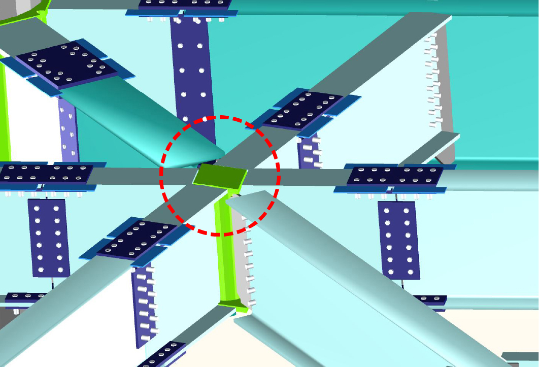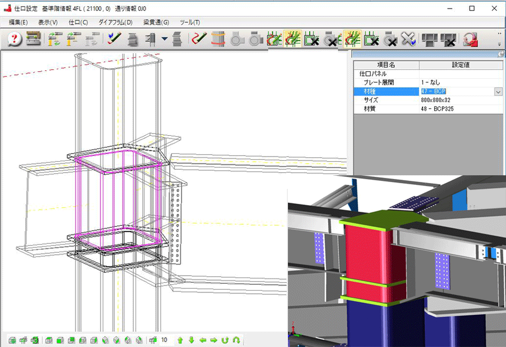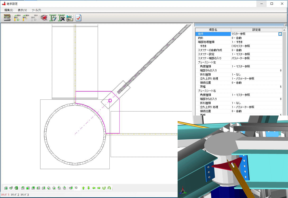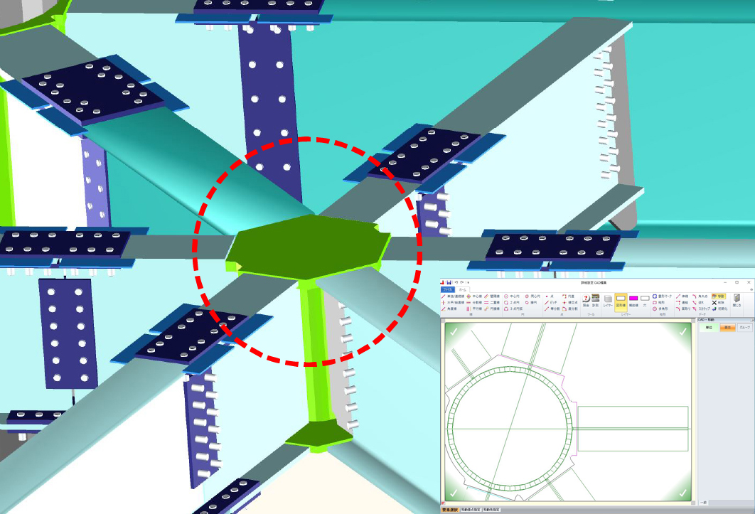 継手や仕口、ハンチなどは個別に細かく編集できます。ガセットやダイアなどのプレート類は汎用CAD的な編集も可能です。部材とのすきま・大きさ・形状など3Dを見ながら微調整できます。CAD編集で、ガセットやダイアフラムをはじめ、多くのプレートを自由な形に変更できます。