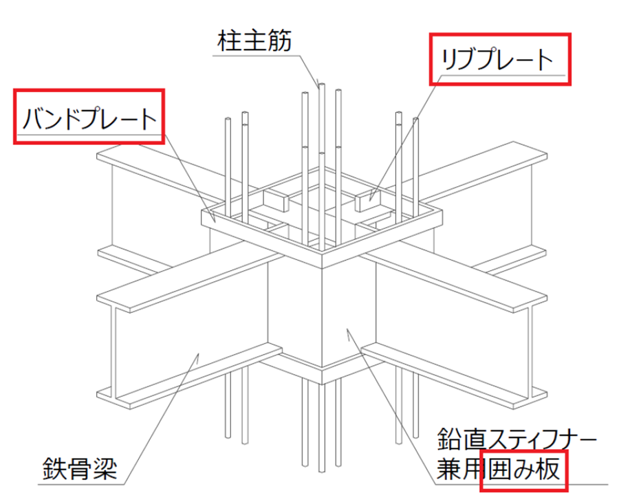 RC柱にH梁を取り合った構法で、梁を貫通させ、RC柱サイズのPLで仕口部を囲ったものを対応になりました。