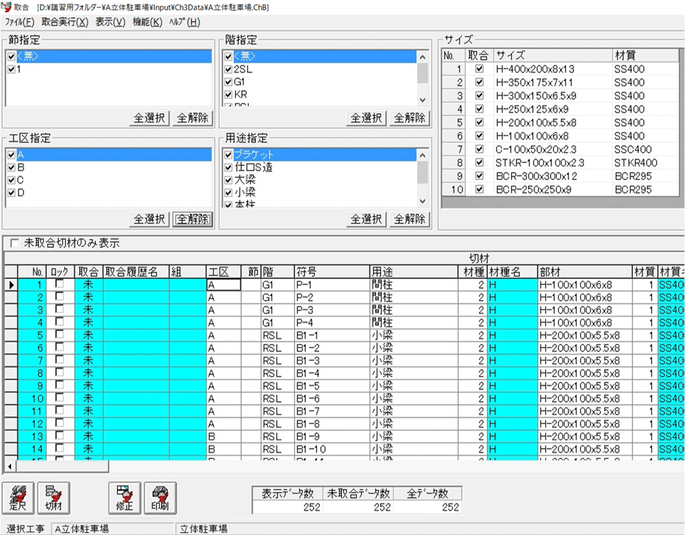 工区や用途、サイズなどで取合い対象の絞り込みが可能。また取合い条件も束ね切り、回転、勾配を考慮して詳細に設定することができます。