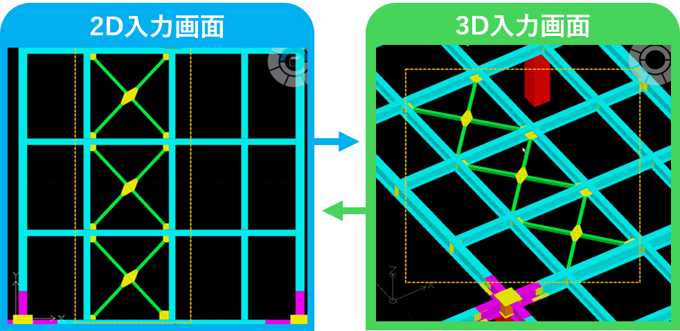 3D入力が可能となり、より直感的な操作・曲線入力を実現し、設計精度の向上に貢献します。入力画面の2D/3D同時表示はもちろん、複数視点の同時表示が可能となっており、スムーズな入力切り替えができるため、ご自身のスタイルに合わせた操作方法で作業することができます。