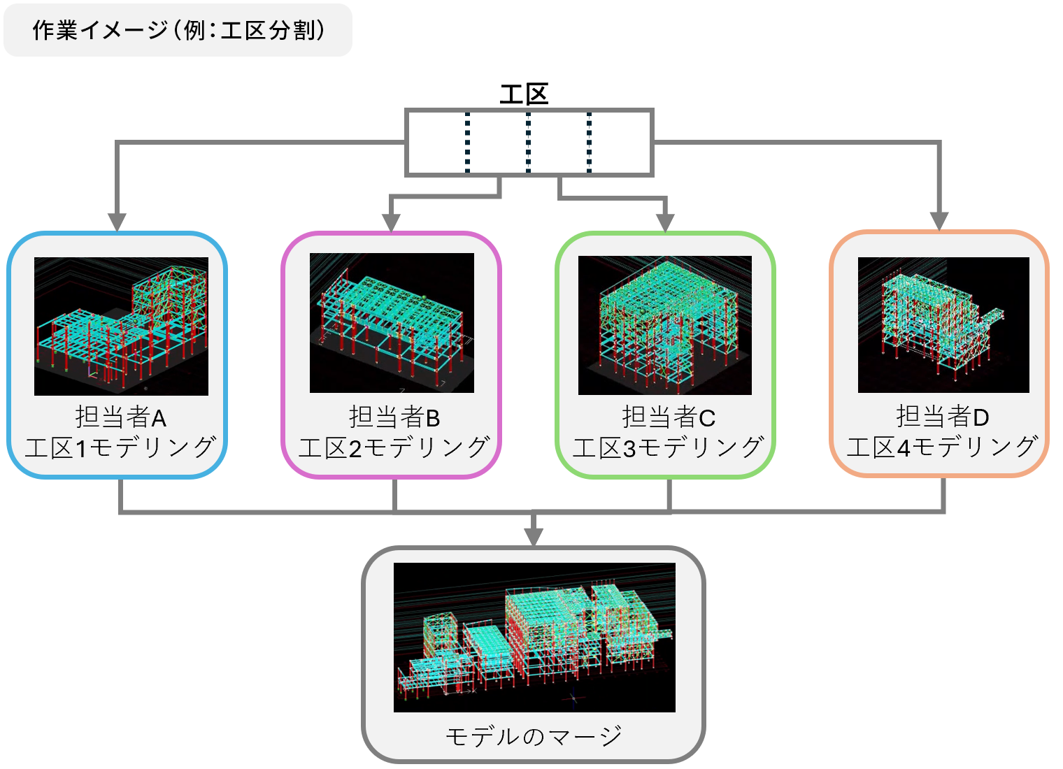 工区やフロア等で分割して同時並行で作業することにより、作業の効率化に貢献します。