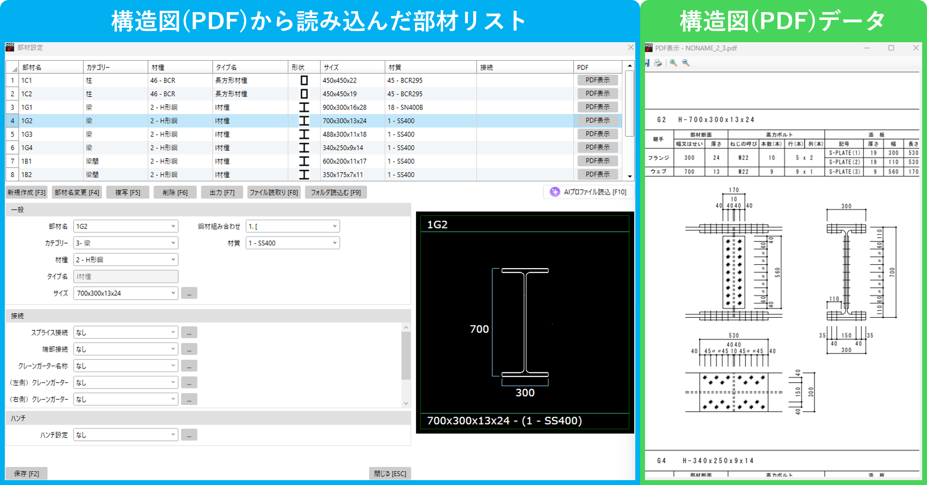 その他にも、AIを活用し、構造図(PDFデータ)から部材リストデータを自動で読み込む機能もあり、作業時間の短縮を実現します。