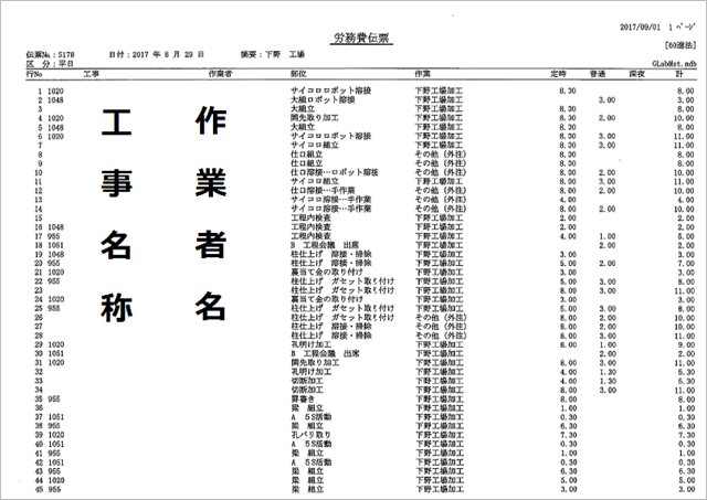 工事別加工費、外注費、社内配送費、検査表など作業別に項目を作成して利用しています。
